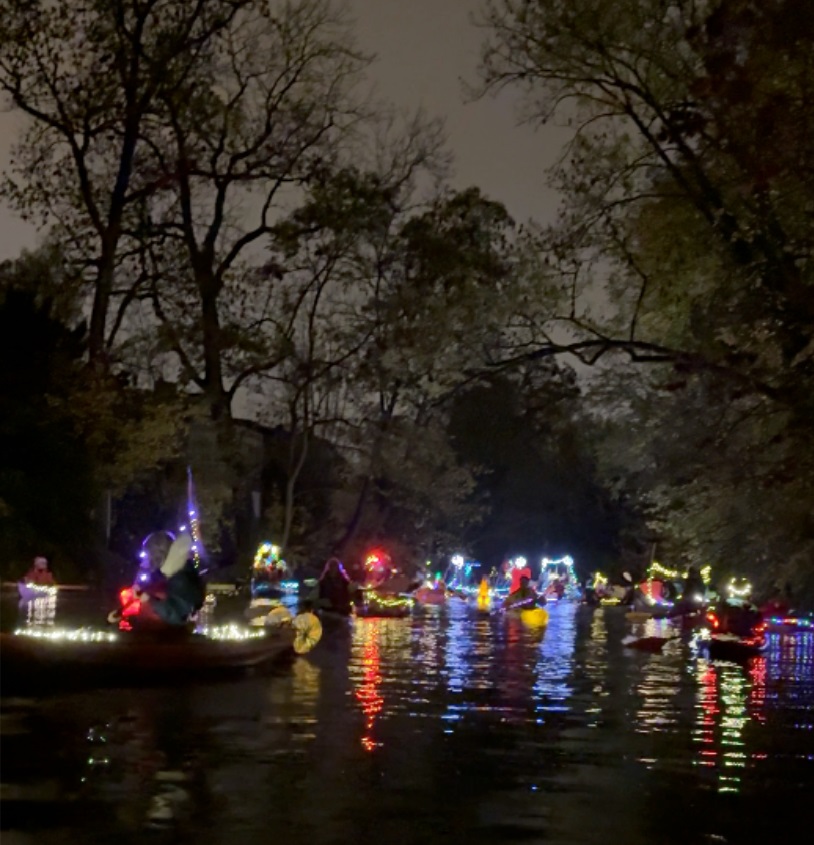 Im gemütlichen Tempo ging es auf die 7 km lange Strecke (3,5 km in jede Richtung). Rund 150 individuell geschmückte Boote zaubern durch ihre kunterbunten Beleuchtungen wundervolle Spiegelungen und Reflexionen auf die Wasseroberfläche.